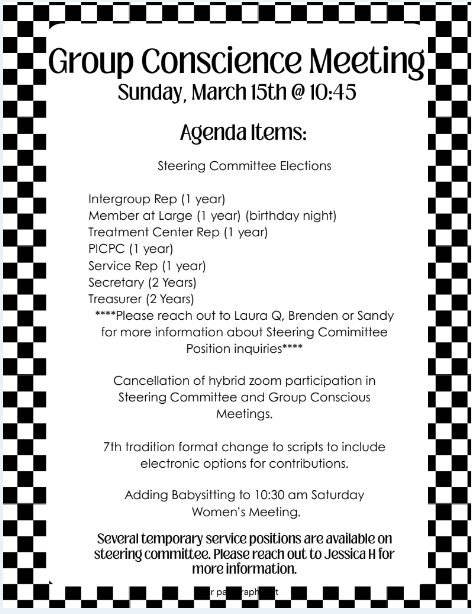 Our next Group Conscience Meeting will be on Sunday, March 15, 2026, at 10:45 am